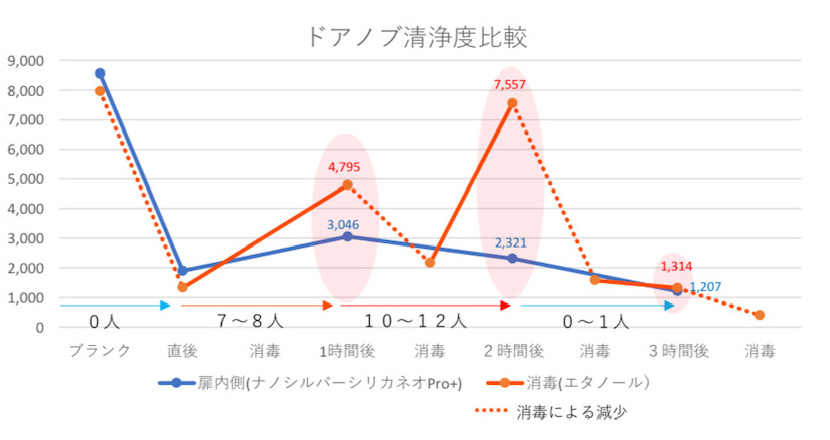 ドアノブに塗布、時系列でウィルス数を確認